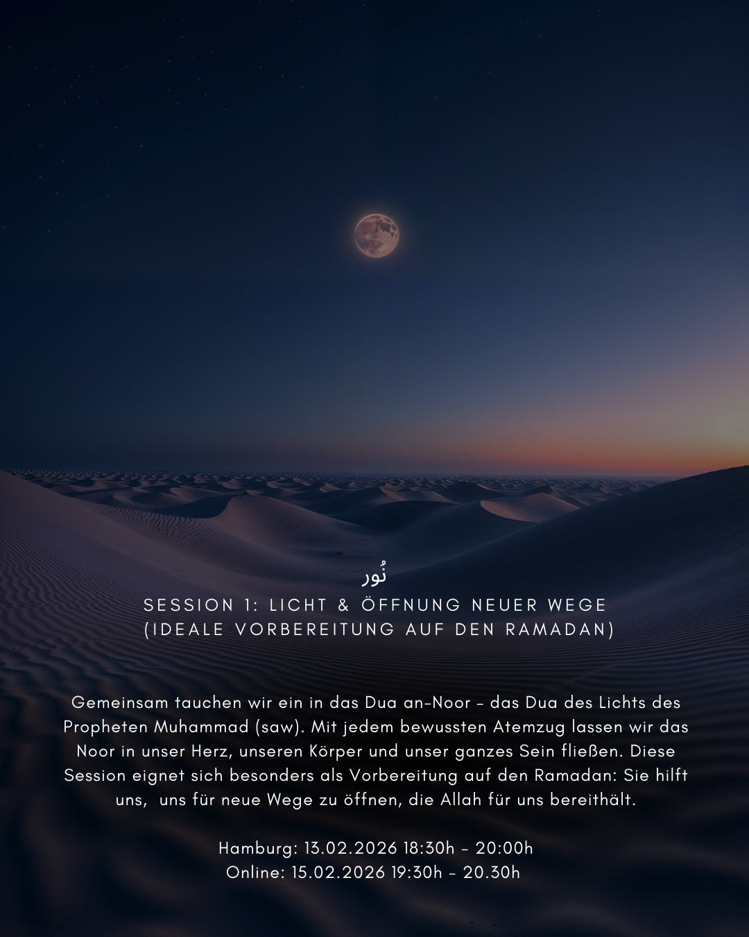 Gemeinsam tauchen wir ein in das “Dua an-Noor” (Dua des Lichts) des Propheten Muhammad ﷺ. Mit jedem Atemzug lassen wir Noor in uns hineinströmen - in unser Herz, unseren Körper und unser ganzes Sein. Diese Session eignet sich hervorragend als Vorbereitung für den Ramadan: sie hilft uns, uns für neue Wege zu öffnen, die Allah für uns bereithält.
