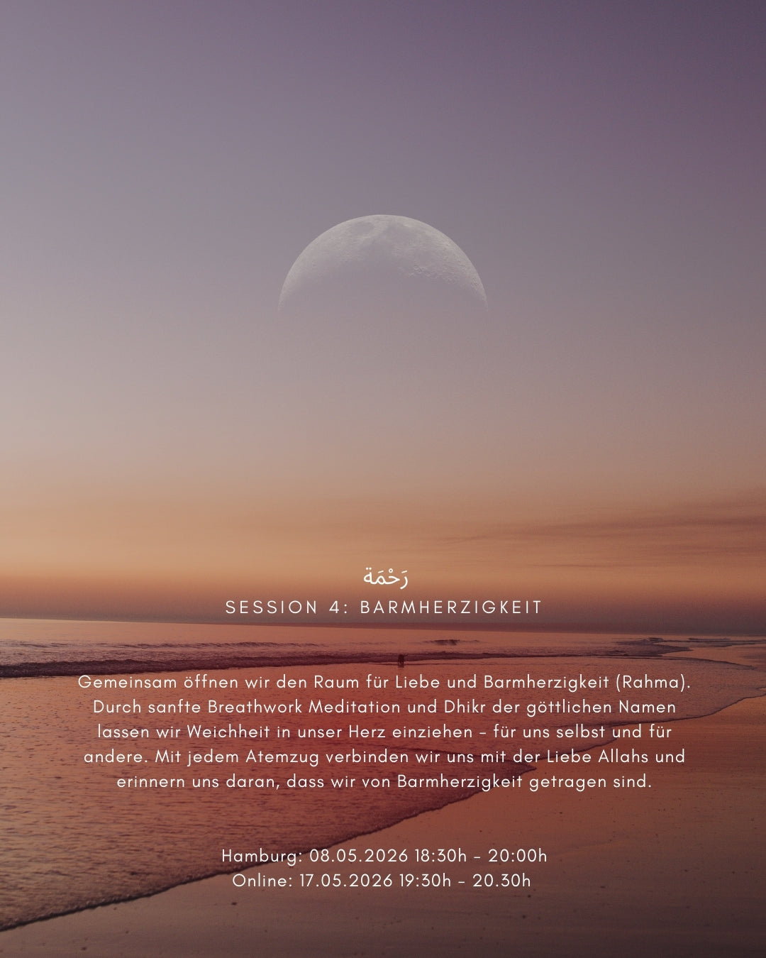 Gemeinsam öffnen wir den Raum für Liebe und Barmherzigkeit (Rahma). Durch sanftes Breathwork und Dhikr der göttliche Namen lassen wir Weichheit in unser Herz einziehen - für uns selbst und für andere. Mit jedem Atemzug verbinden wir uns mit der Liebe Allah und erinnern uns daran, dass wir von Barmherzigkeit getragen sind.